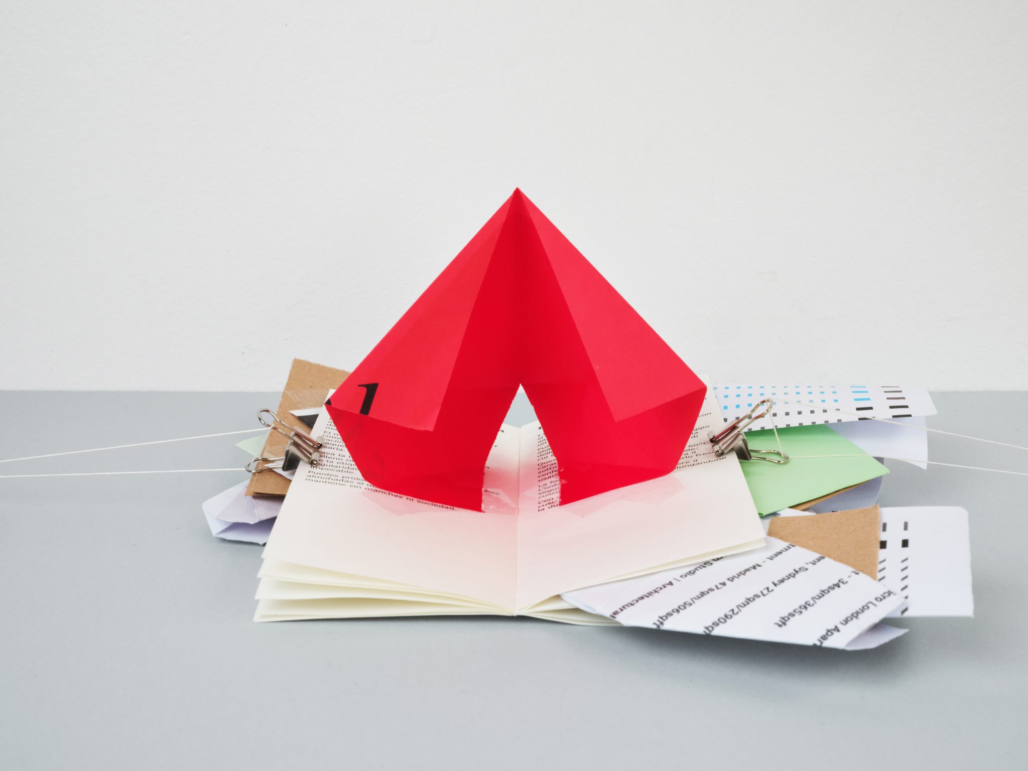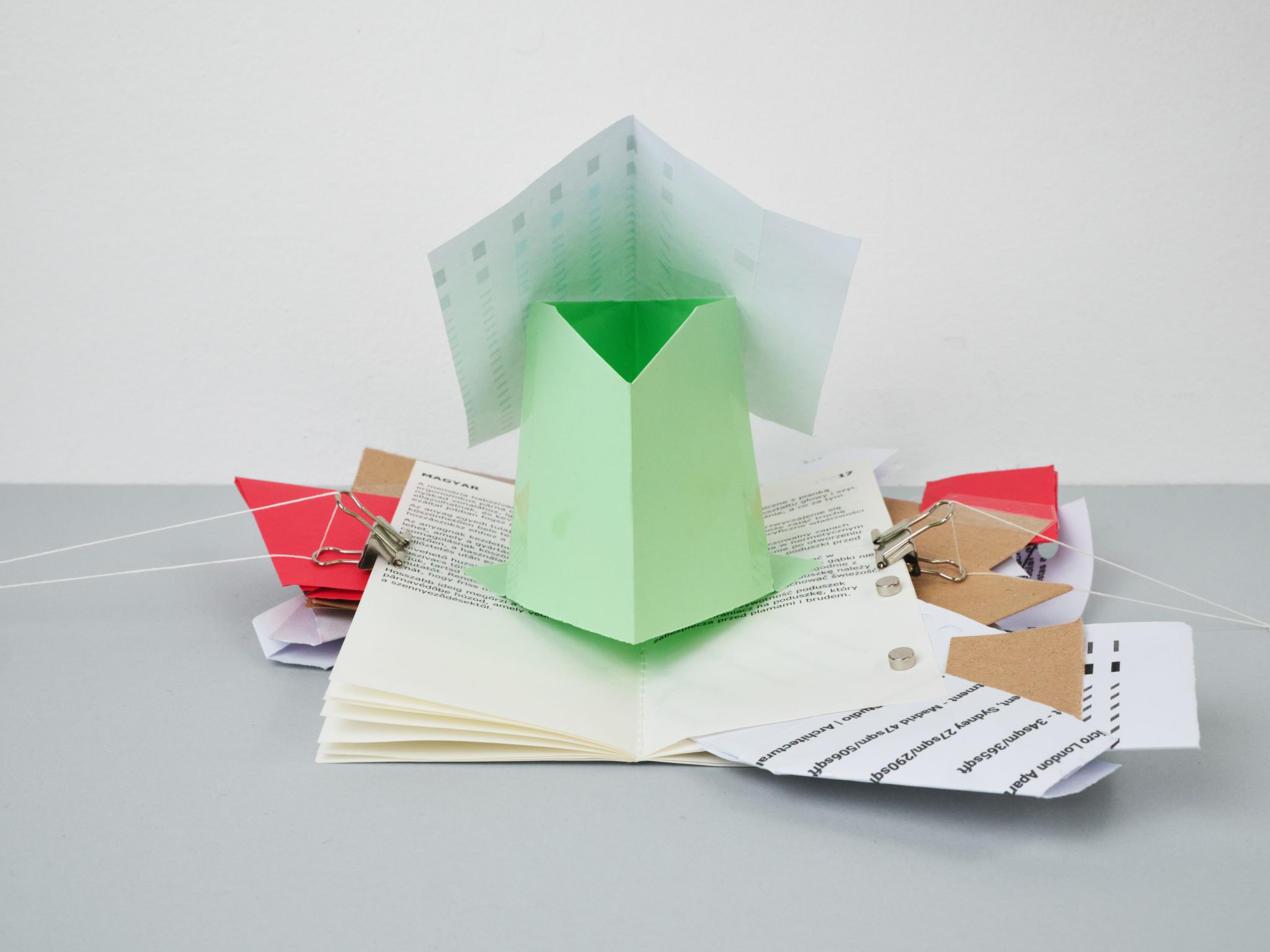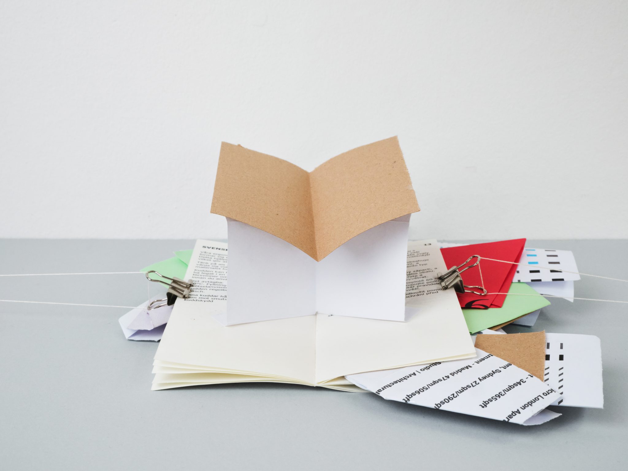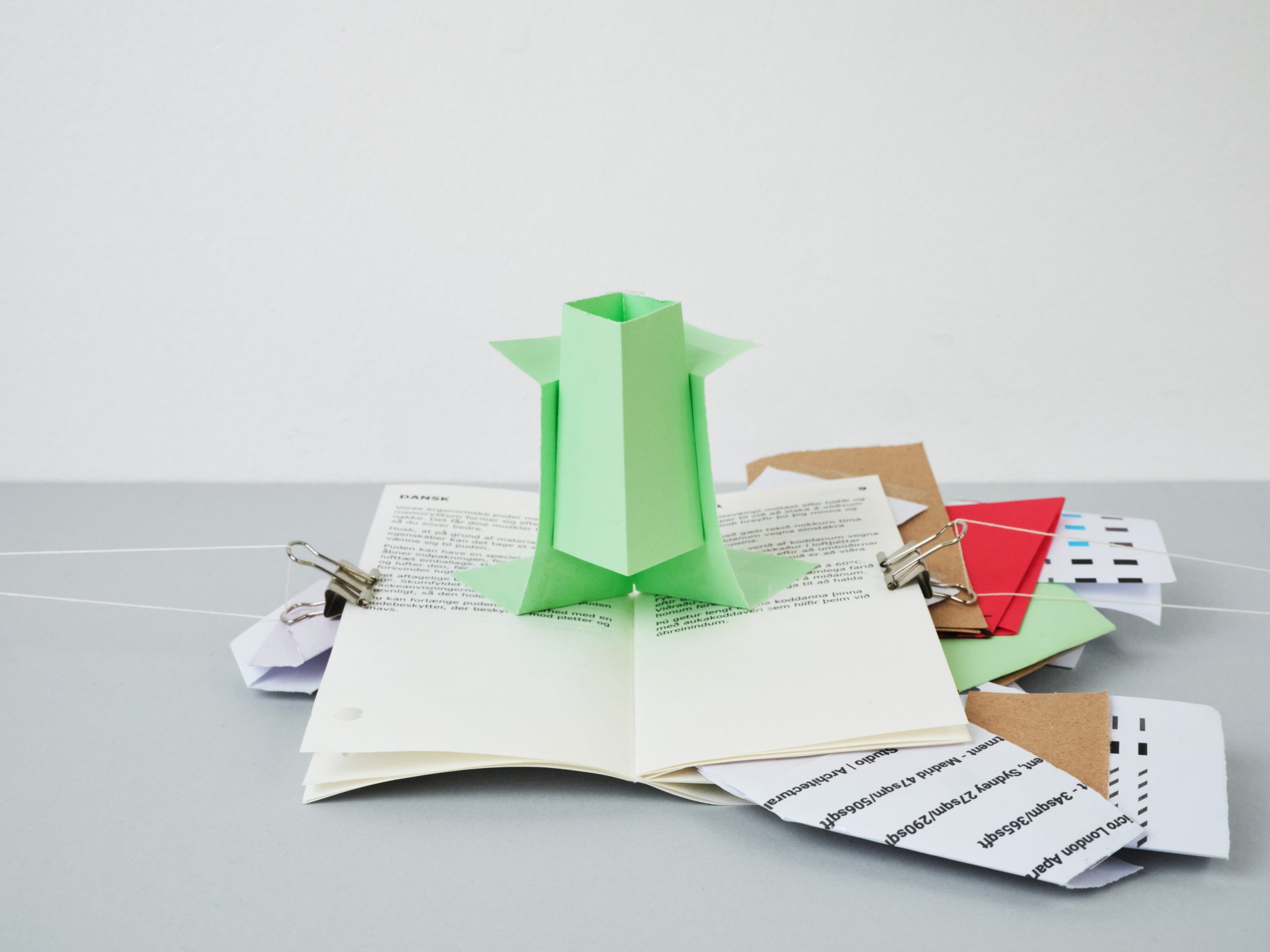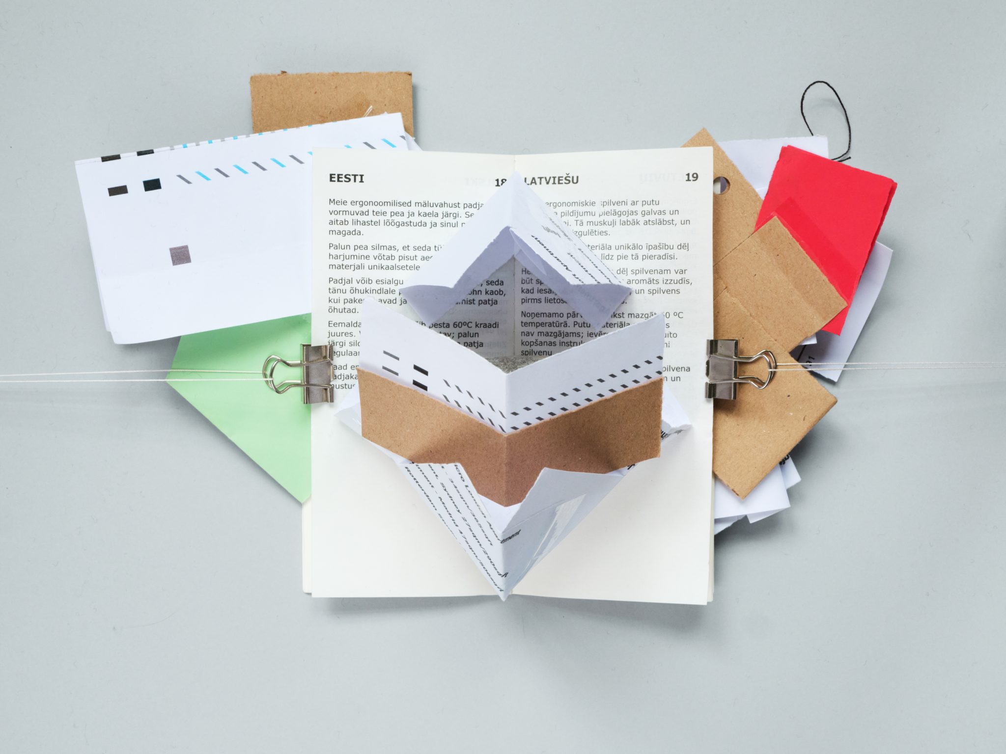 Handmade prototype / Found instruction manual, recycled papers, tape, glue, pen and stencil.