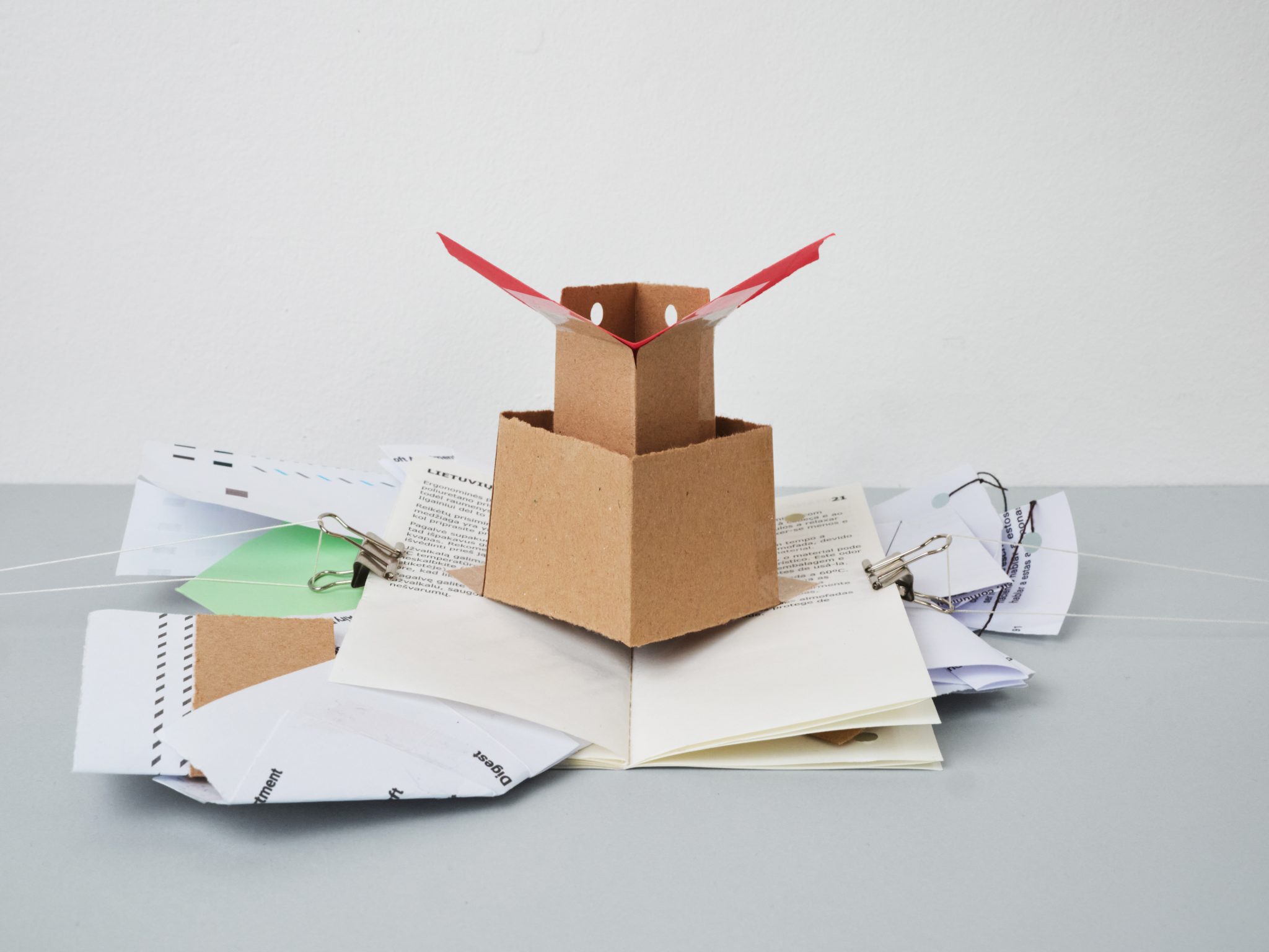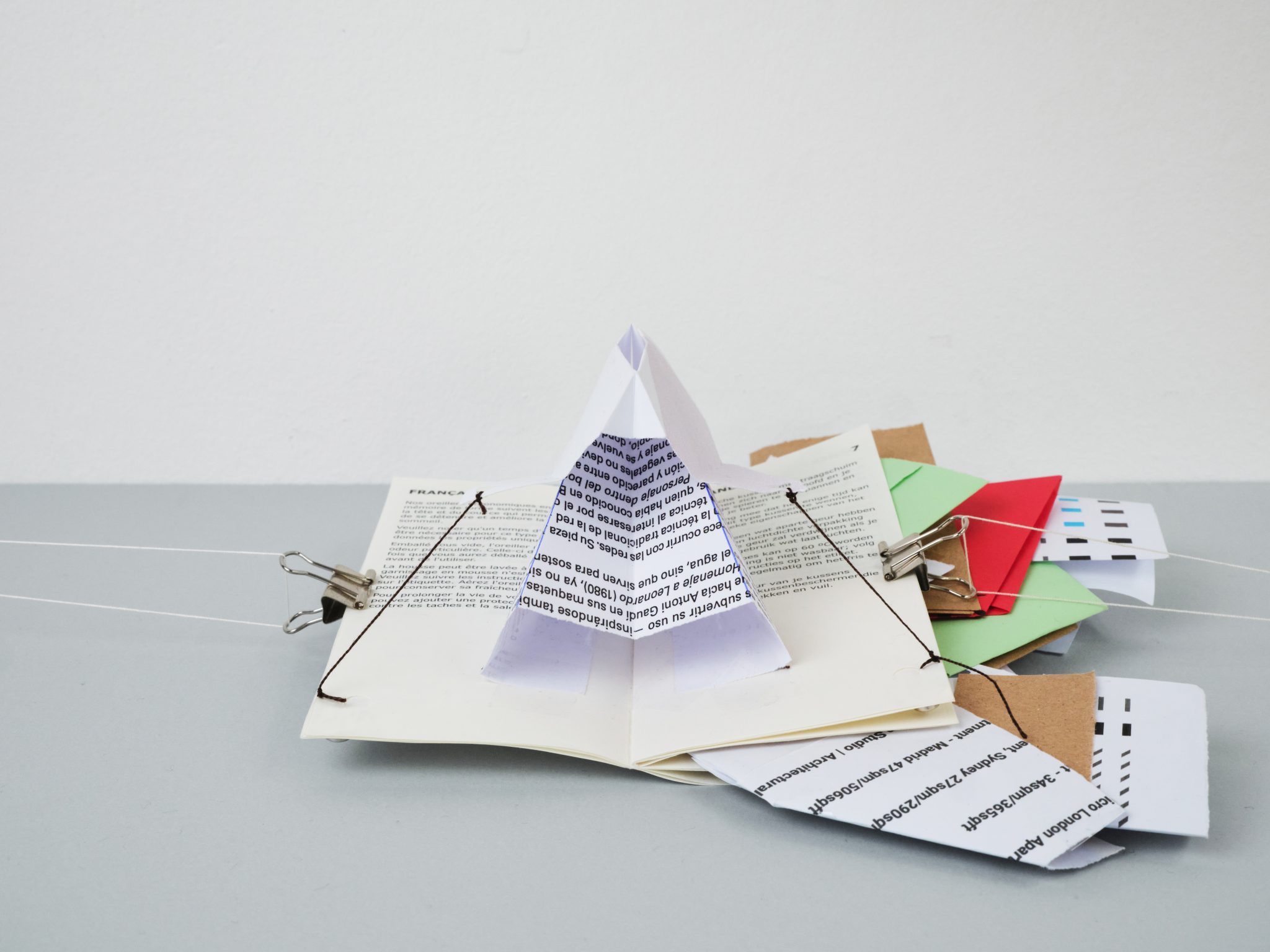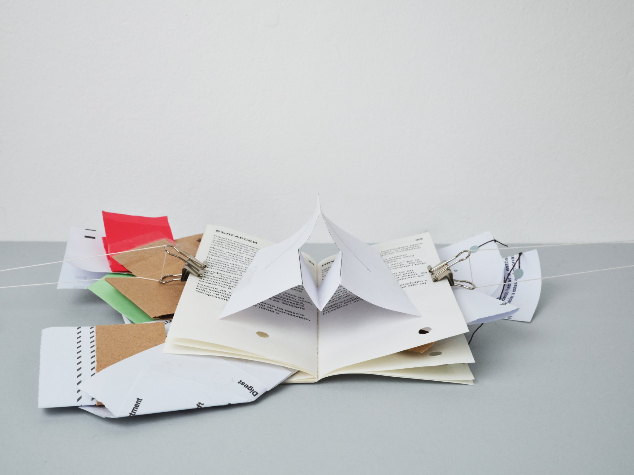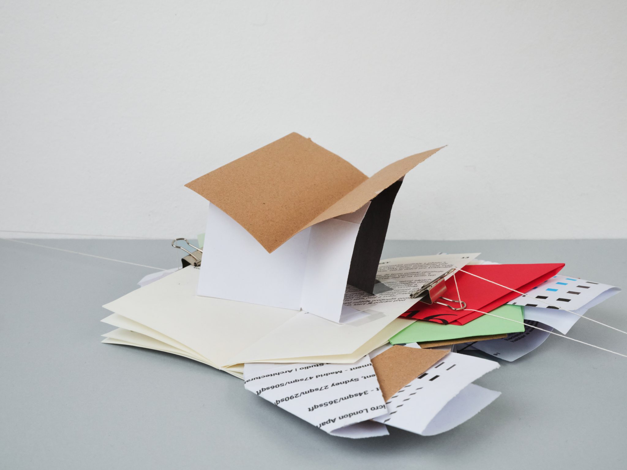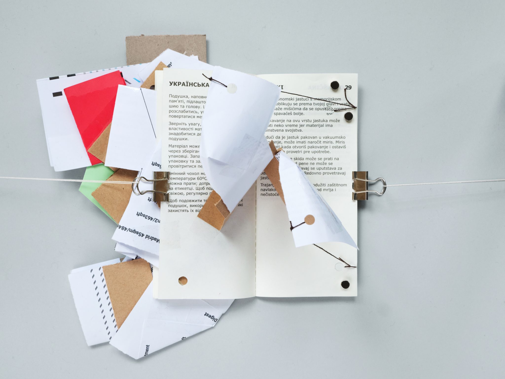 Handmade prototype / Found instruction manual, recycled papers, tape, glue, pen and stencil.